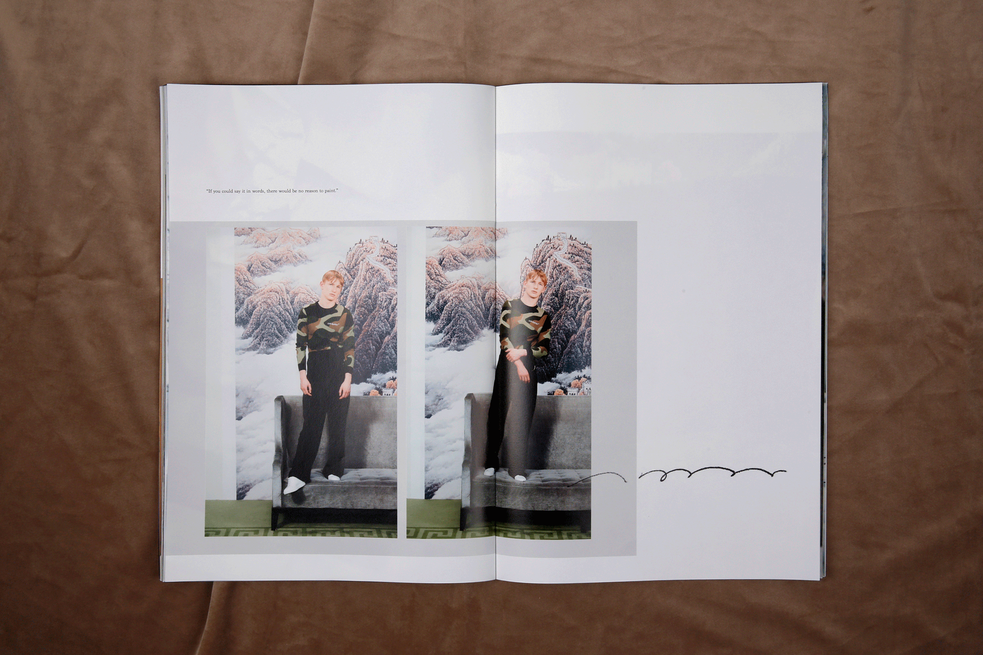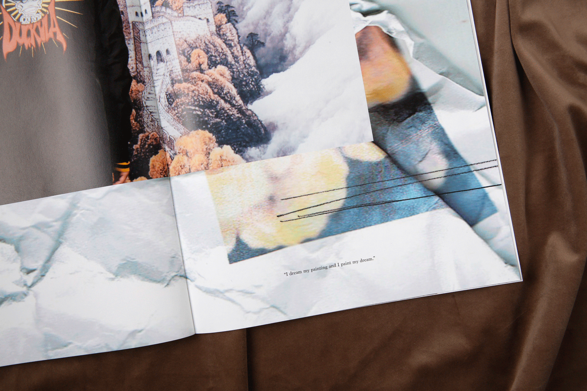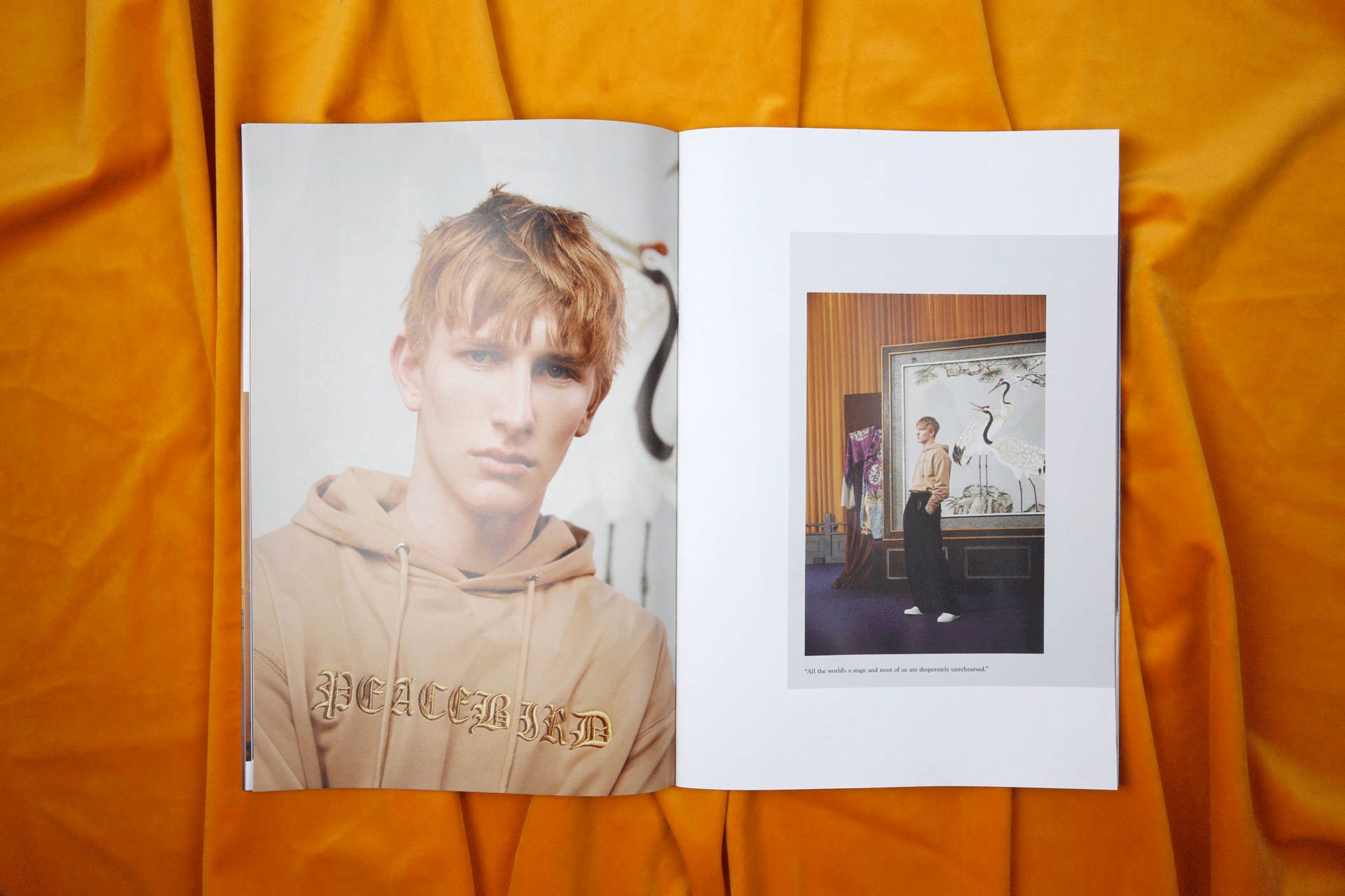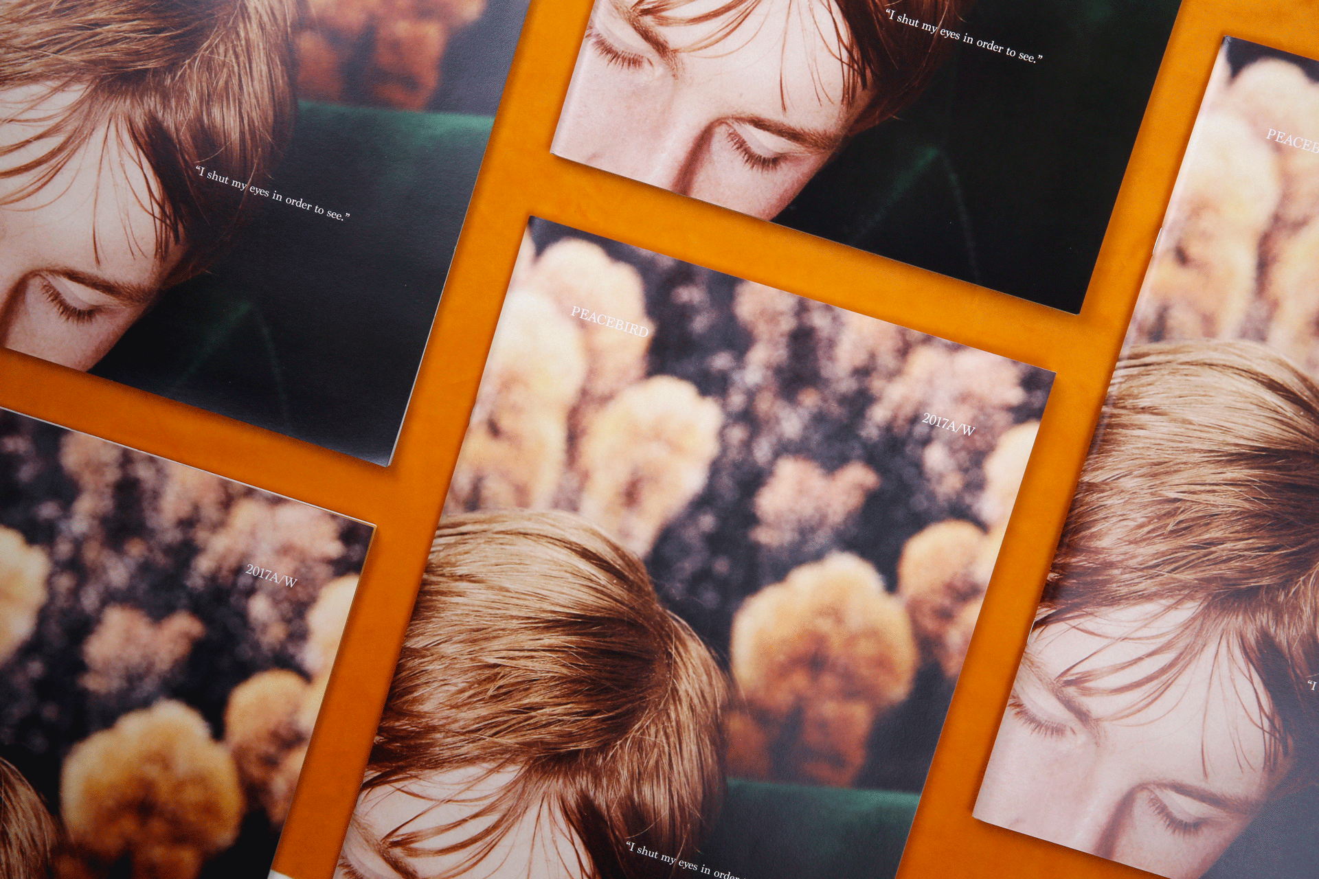 以下为太平鸟委托设计2017秋冬斯文系列的服装型录。这一季的主题围绕着剧场展开,本身的照片感觉有很强烈的油画质感。为了让众多的图片可以统一在一起,呈现出统一的视觉感受,我巧妙地在一些画面里,加入了以剧场为主题的英文短句,短句控制在寥寥几个字之内,反复去读,却又有双层的含义可以回味。画面之间穿插了一些随意的铅笔笔记和扫描好的褶皱草稿纸,呼应剧场的戏剧感和冲突感。最后用丝绒的布面为背景进行拍摄,突出这本册子安静内敛的质感。