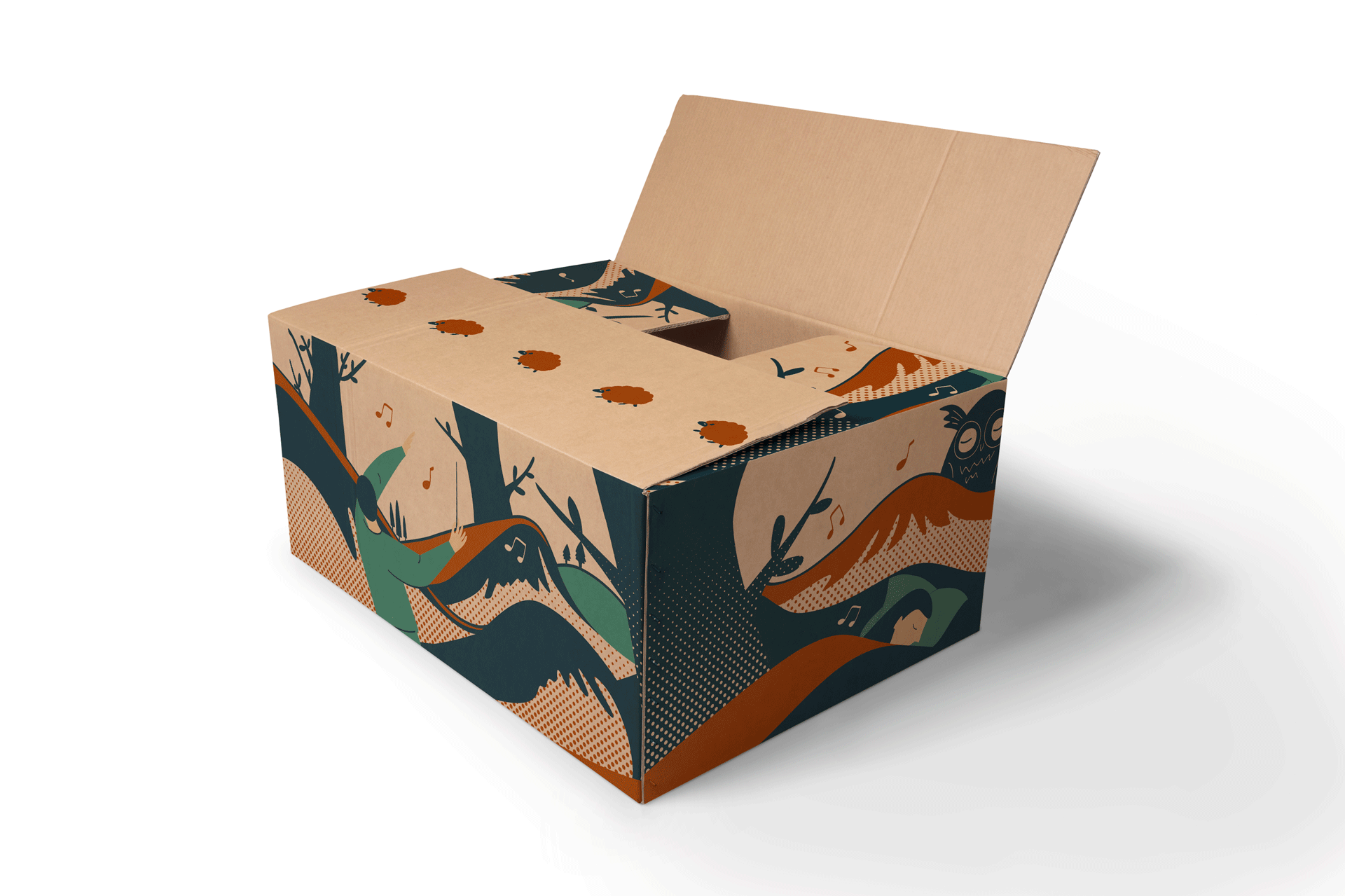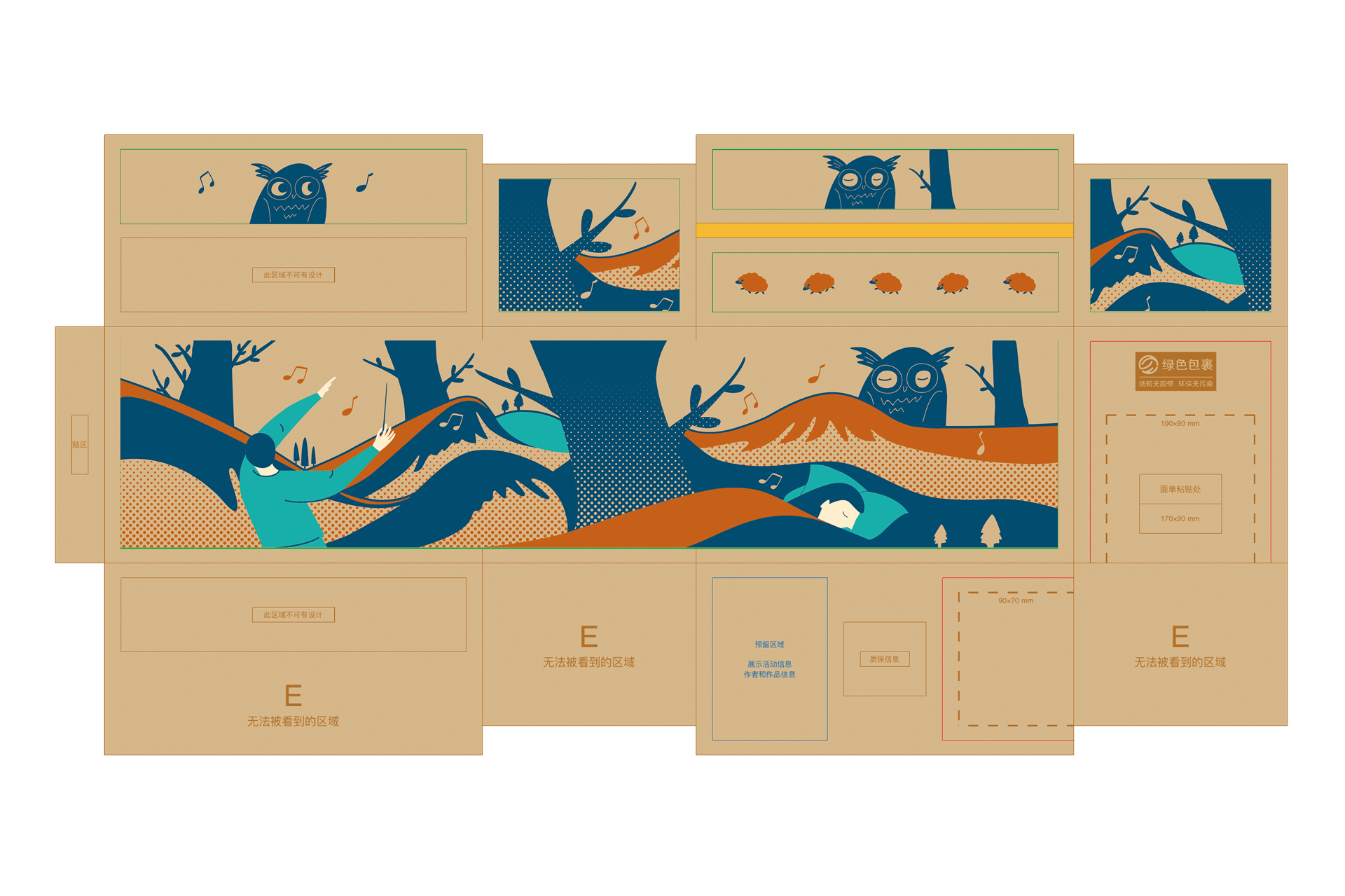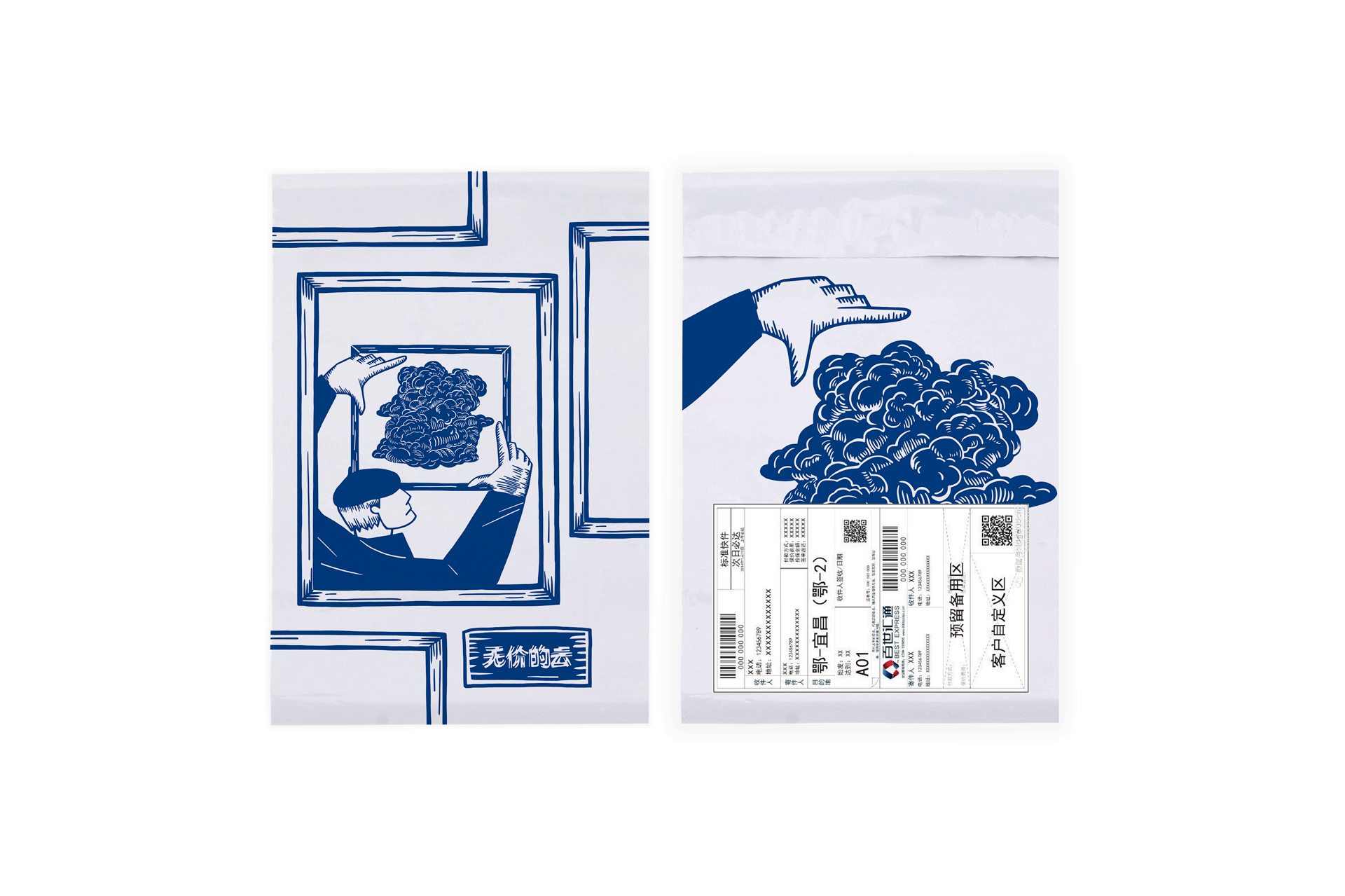 为淘宝造物节的菜鸟快递设计环保快递袋和环保纸箱。【纸箱:山林游乐场 - 探讨人与森林自然的关系】万物皆有灵,我们看不见它,却更可以去想象。常听说山的神灵,它里城市最远,它是从前地球上的“高楼”。山有怀抱,它愿意敞开。那就去听山风的声音,树叶的声音,鸟的声音,那便是山灵的嬉戏,游乐。【快递袋:云的失踪记事 - 关注空气污染问题】“云”失踪了。它被工业区的烟尘染色,被商业街的嘈杂吞没……“云”渐渐成为主题,被人们挂在了美术馆,仿佛变得“珍贵”了起来。它开始被视为无价的珍宝,而这是我们无法挽留却又仅存的悼念方式。