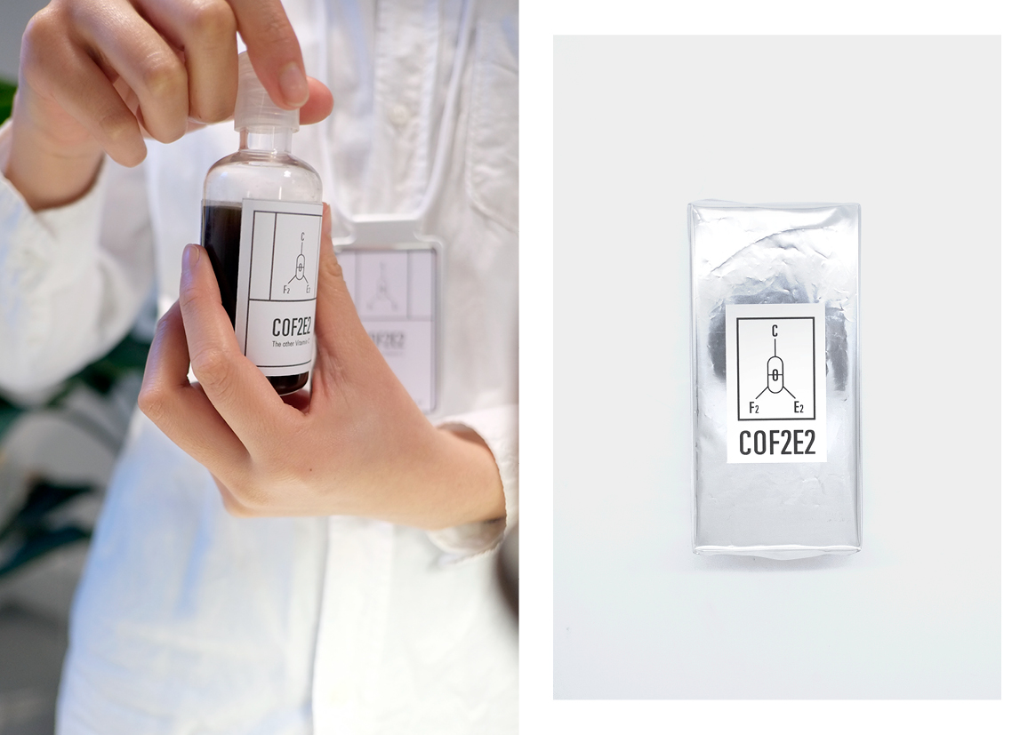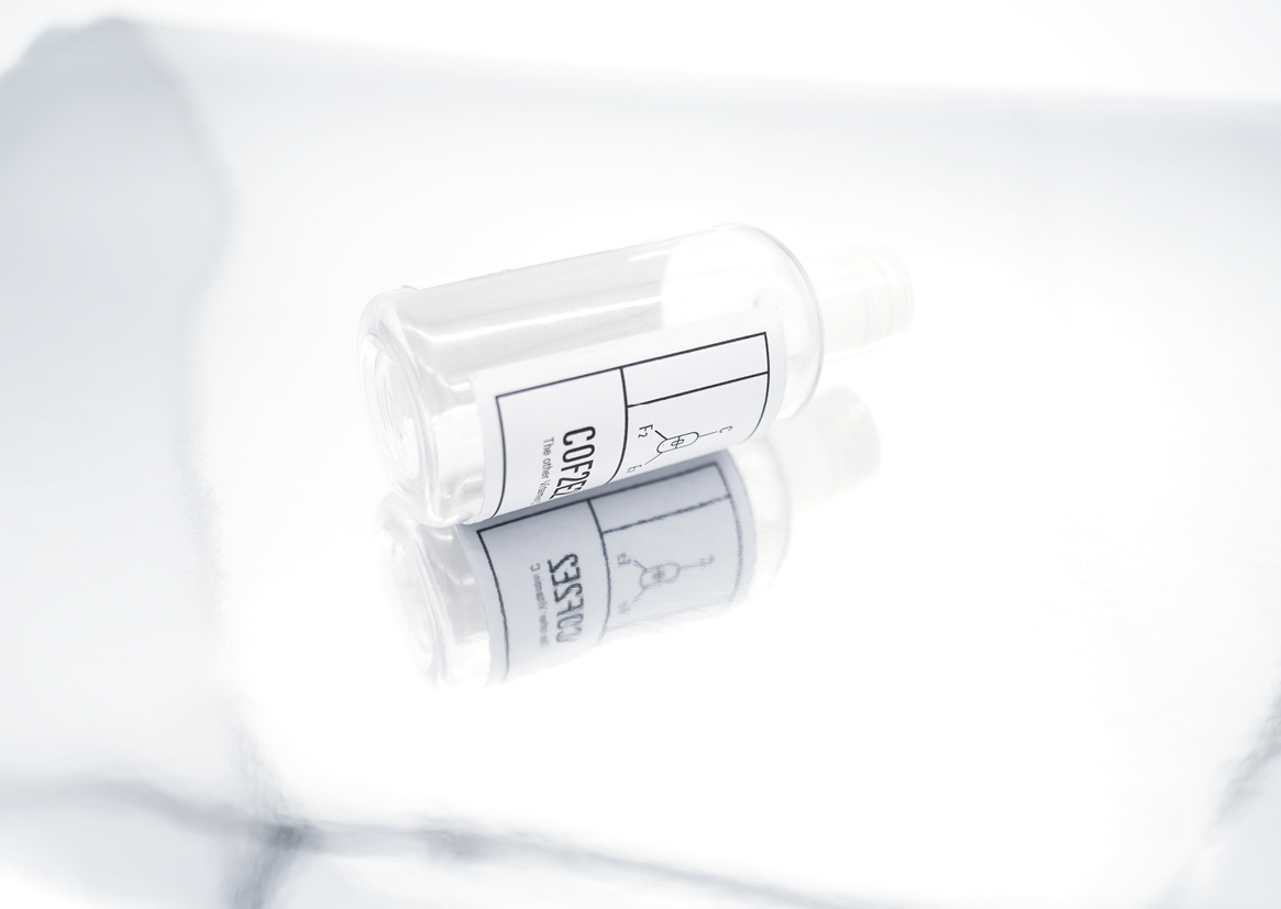 在对咖啡的'再‘思考的过程中,我们发现坚持每天喝咖啡的我们对待它更像是一种精神药物的依赖。于是,根据对字母COFFEE的重新排列,我们意外发现这个商标其实可以组合成化学公式。通过这样的视觉效果,采用锡纸,反光纸,透明瓶,冷色调的平淡和冷静,都直接传递出咖啡界于“食用”和“医用”模糊概念。