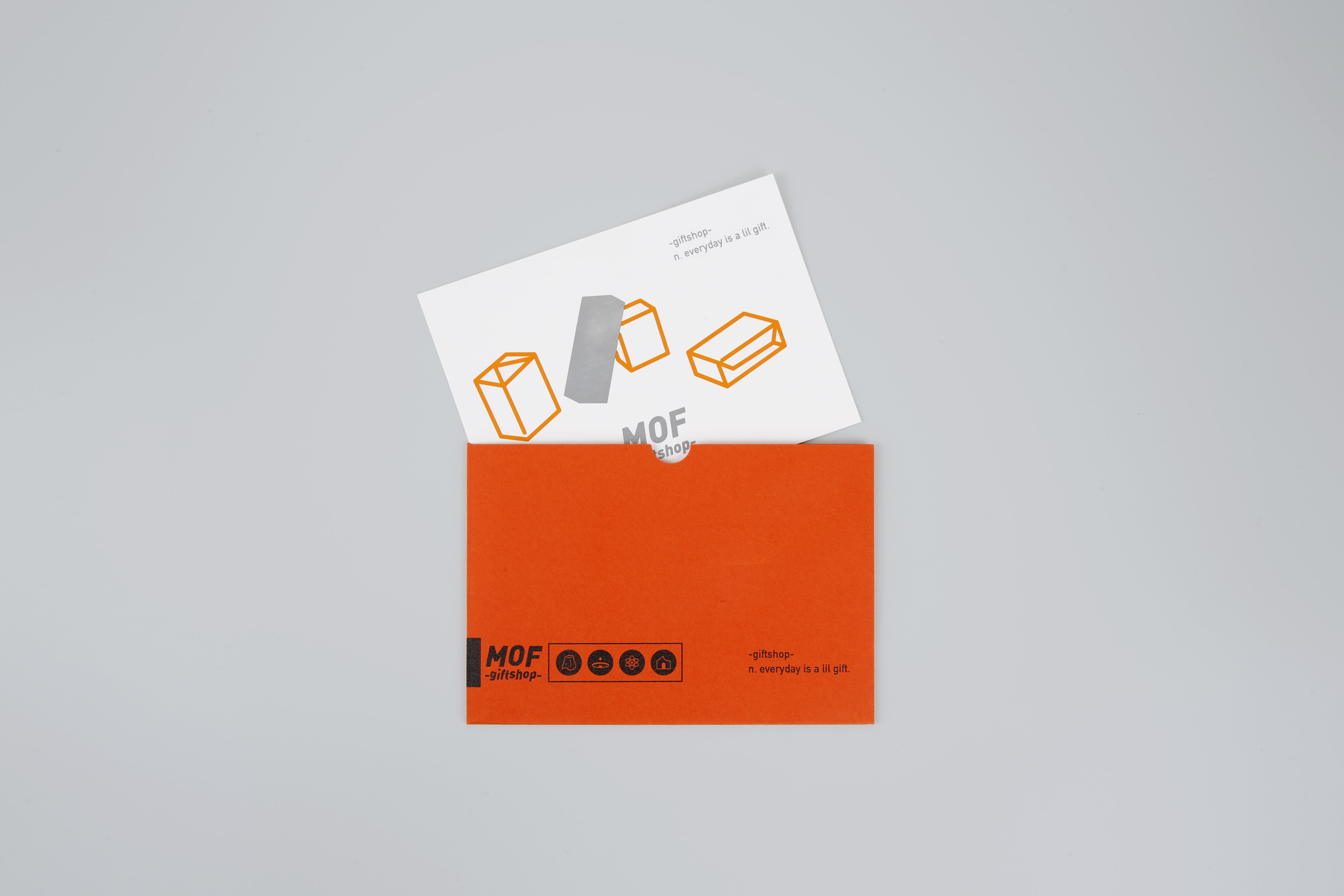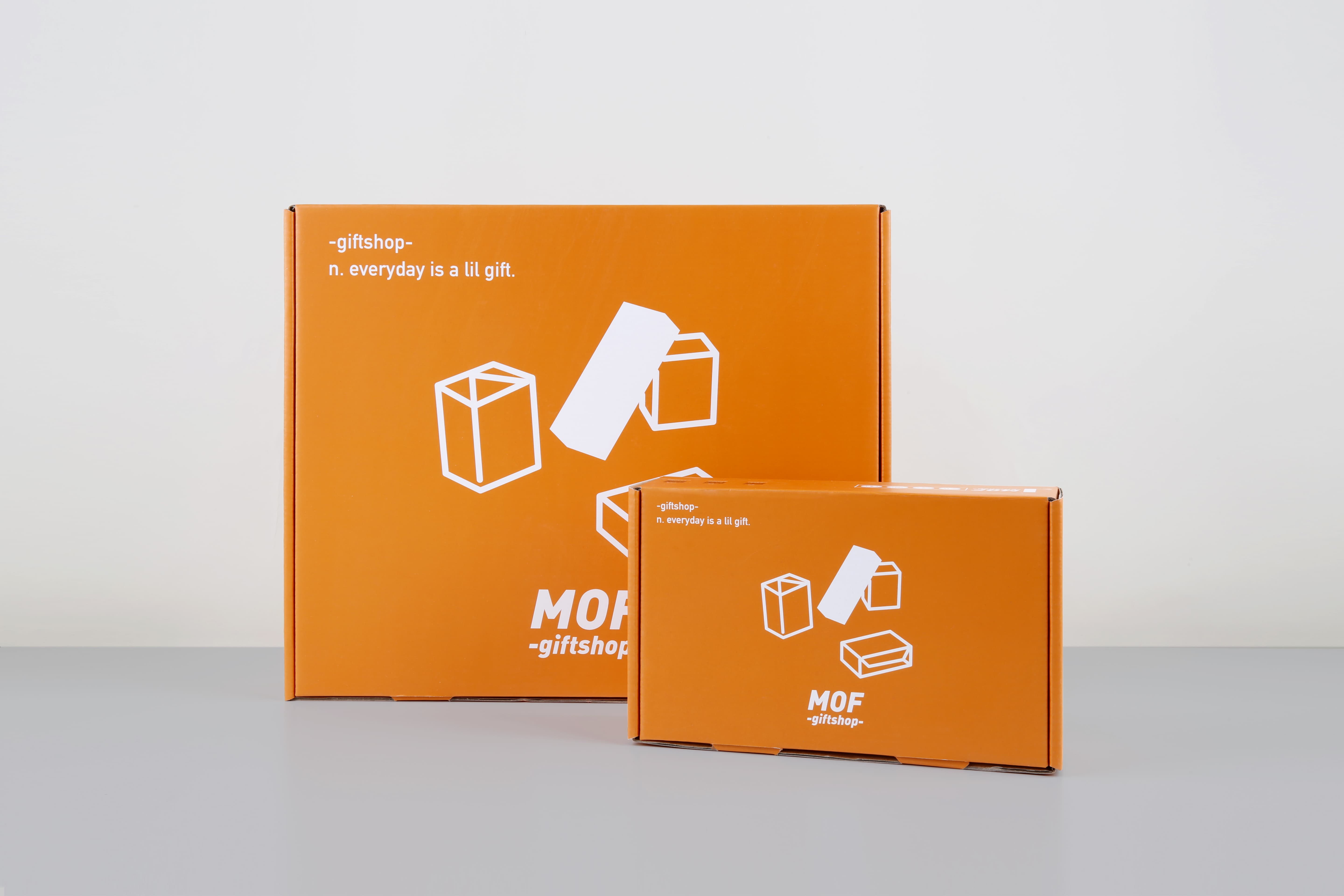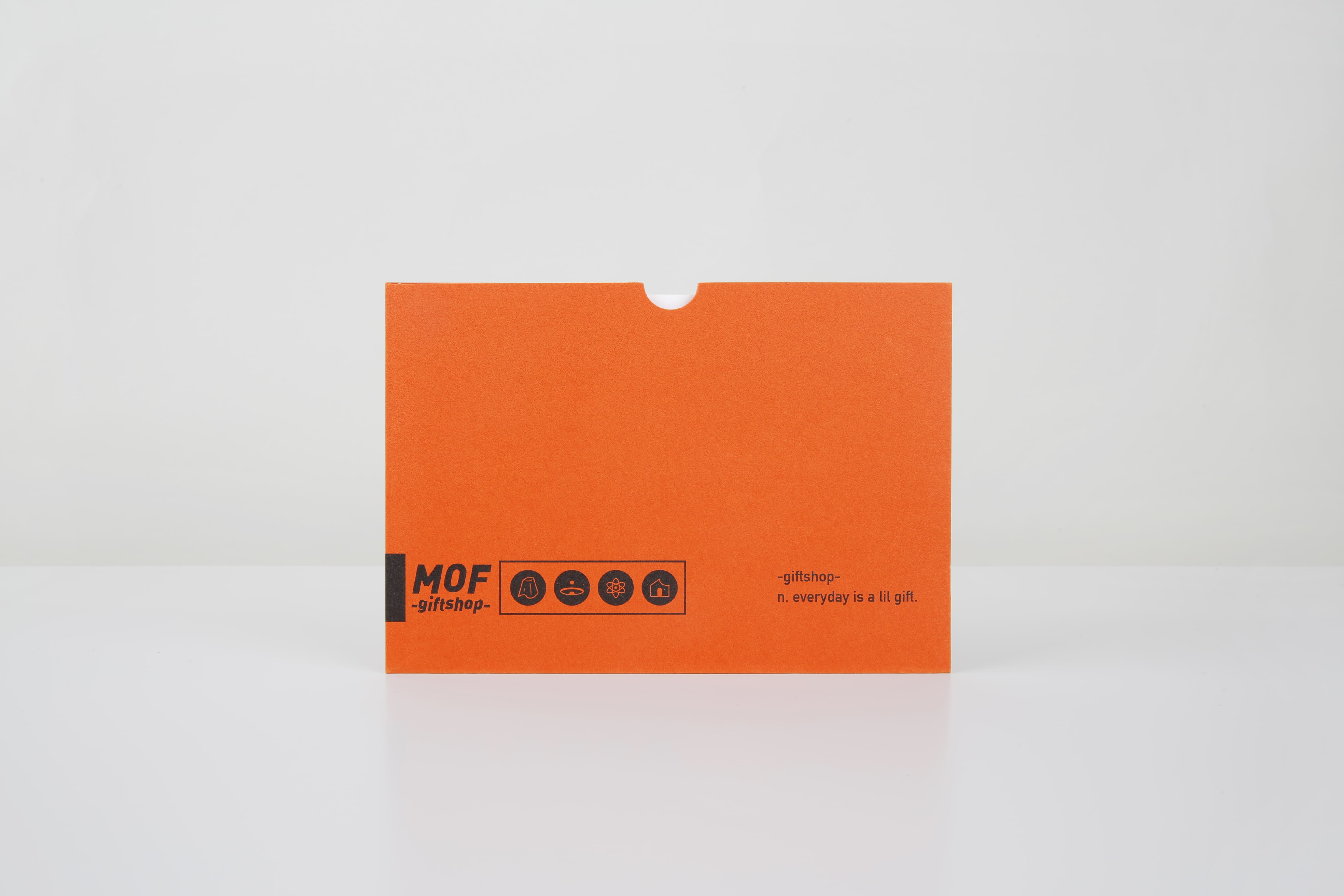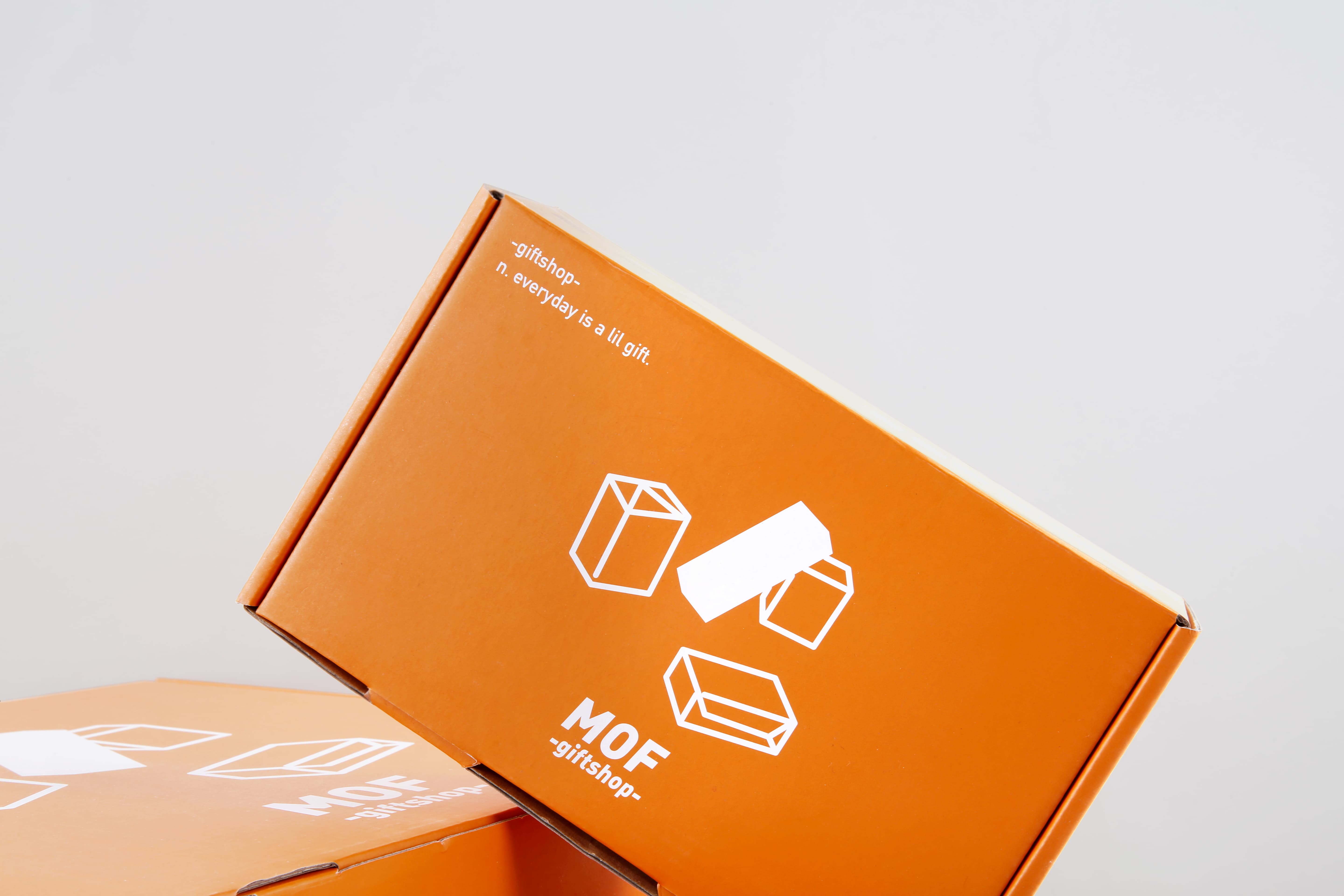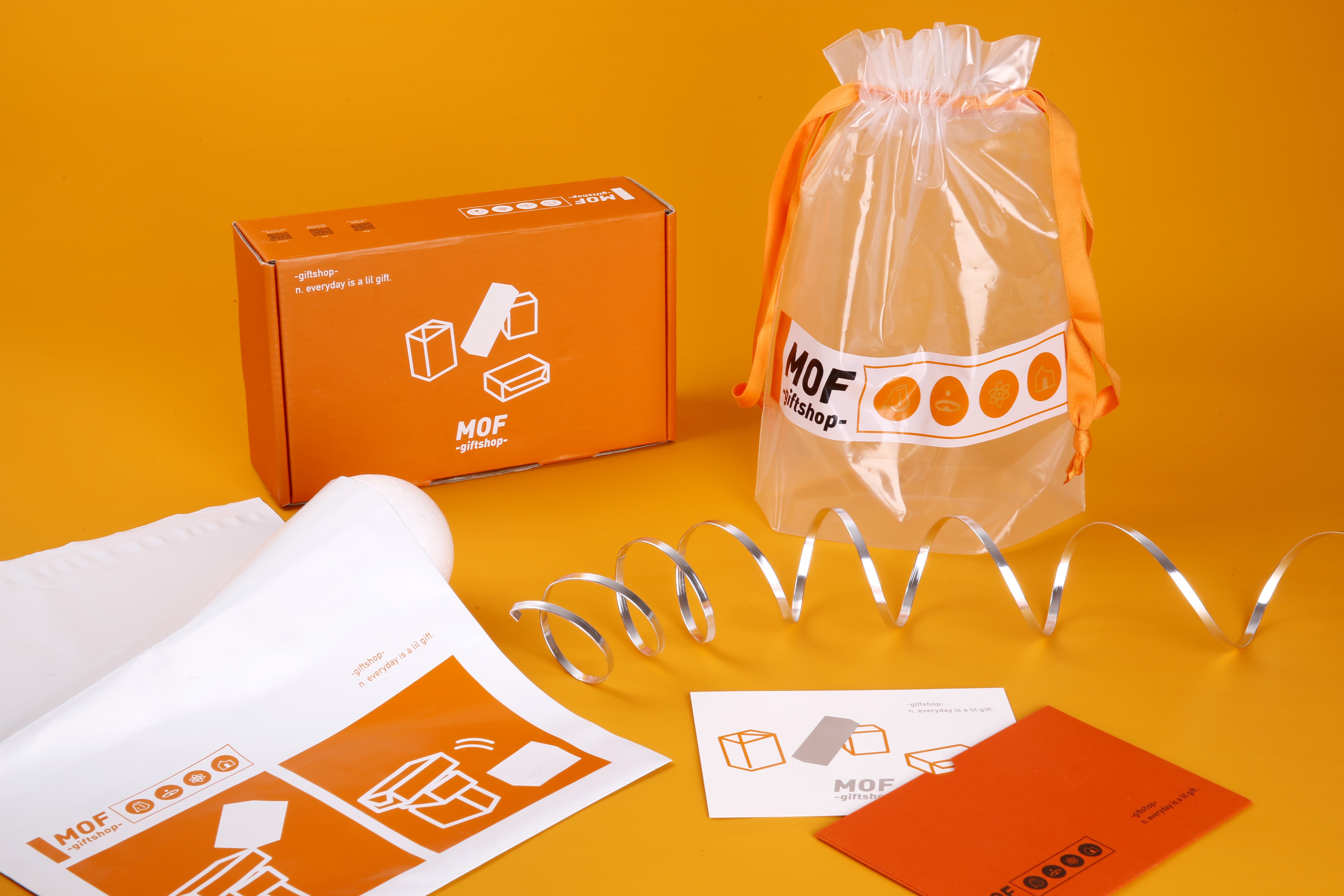 MOF-GIFT SHOP是服装设计师王天墨旗下Museum of friendship的副线品牌。以不同的生活物件,礼品饰品等有趣的产品为媒介,为年轻的女性带去幽默和概念化的购物体验。我们从品牌的标识到快递盒,从贴纸到包装纸,从透明袋到吊牌,从每一波的宣传海报,到顾客的商品回馈单,完整实现了一次别开生面的橘色礼物商店。