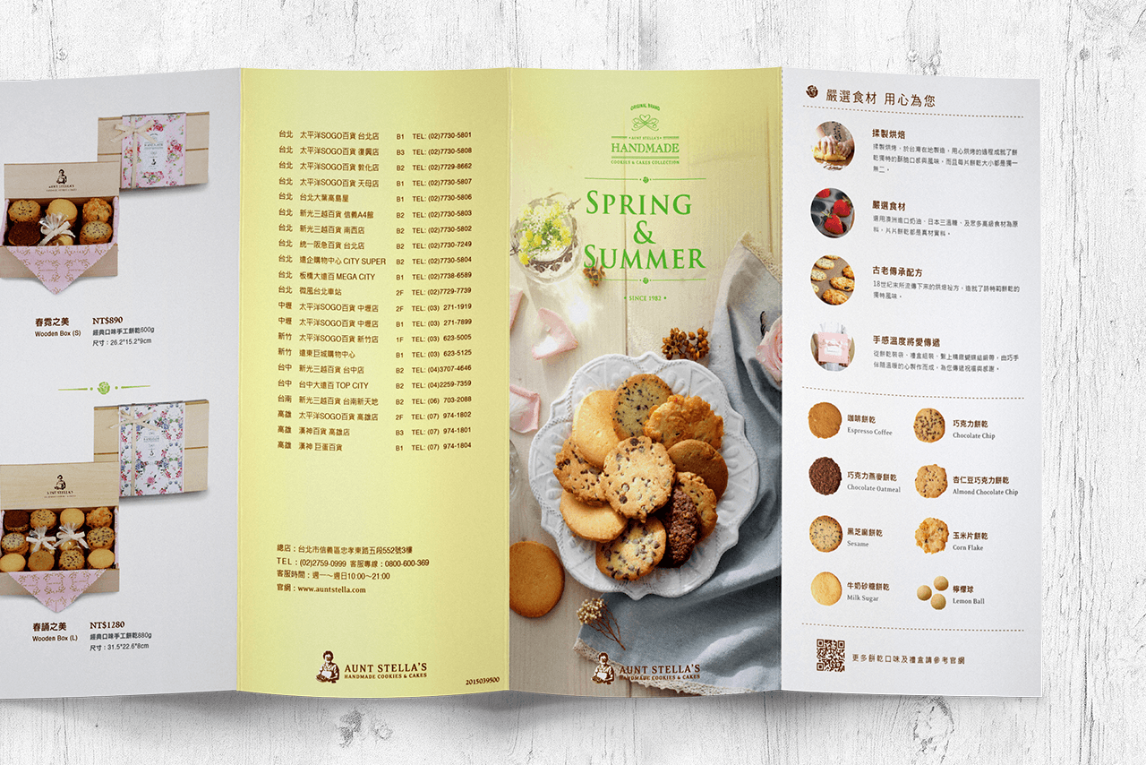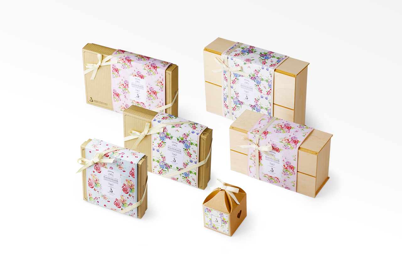 包装风格上表现典雅,可爱中西式的融合。「春夏」绘製了淡雅的水彩插画图绘,「秋」使用了手工刺绣的方式,「冬」拼布以及深层的水彩绘製,呈现在各式季节产品类型,每个产品的共同点都是手工绘製,製作出属于Stella婶婶的包装风格,其目的让消费者族群年轻化并看到焕然一新的婶婶,与手工饼乾的用心。