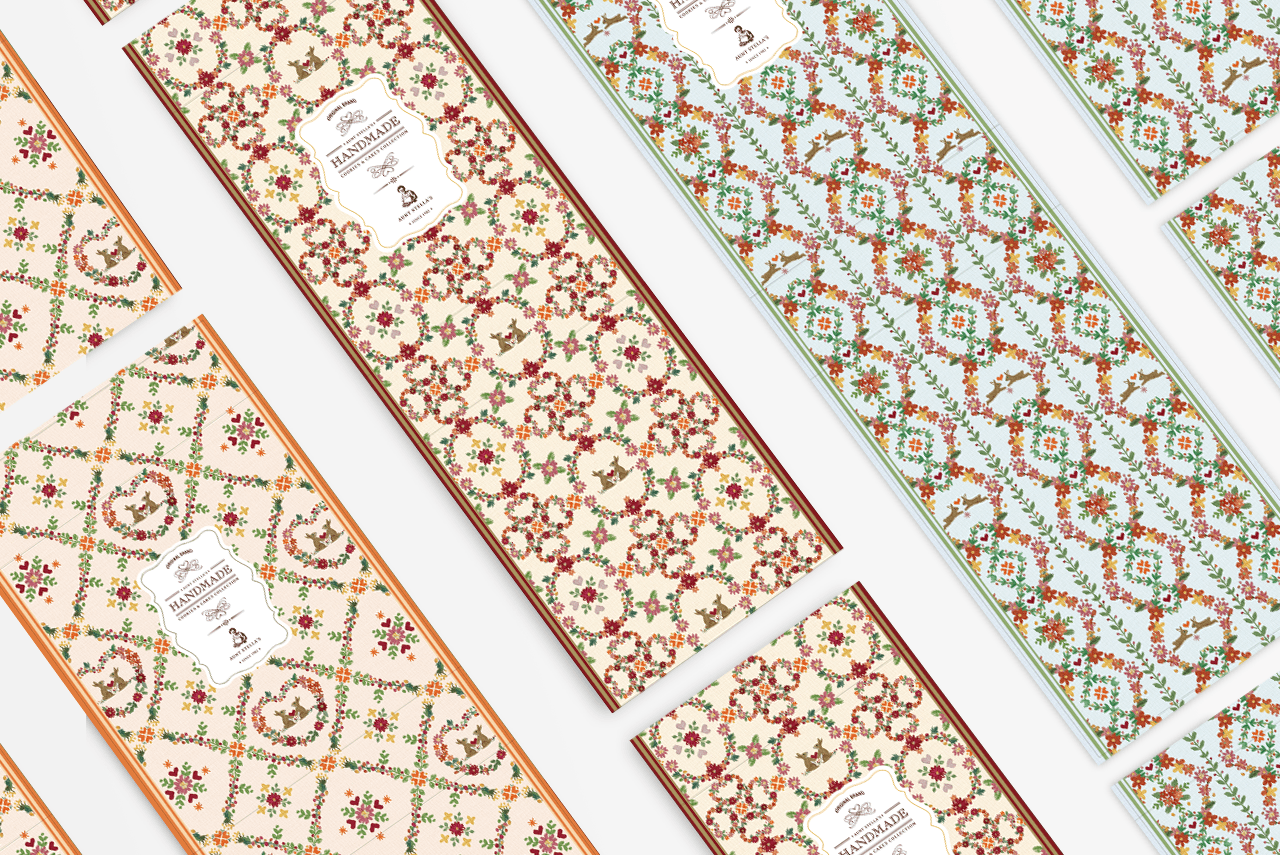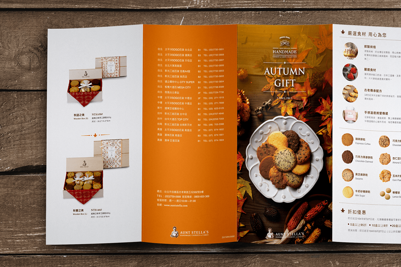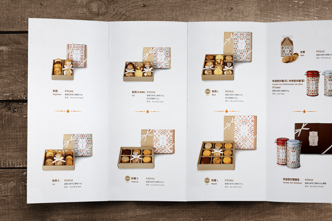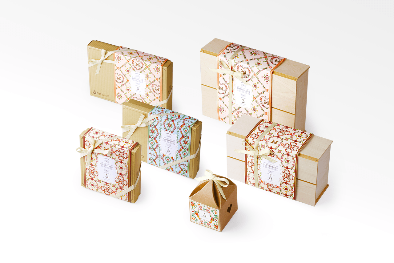 包装风格上表现典雅,可爱中西式的融合。「春夏」绘製了淡雅的水彩插画图绘,「秋」使用了手工刺绣的方式,「冬」拼布以及深层的水彩绘製,呈现在各式季节产品类型,每个产品的共同点都是手工绘製,製作出属于Stella婶婶的包装风格,其目的让消费者族群年轻化并看到焕然一新的婶婶,与手工饼乾的用心。