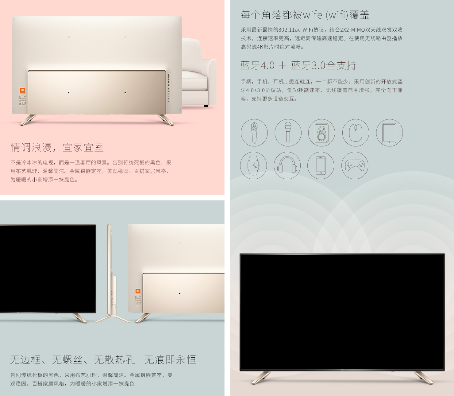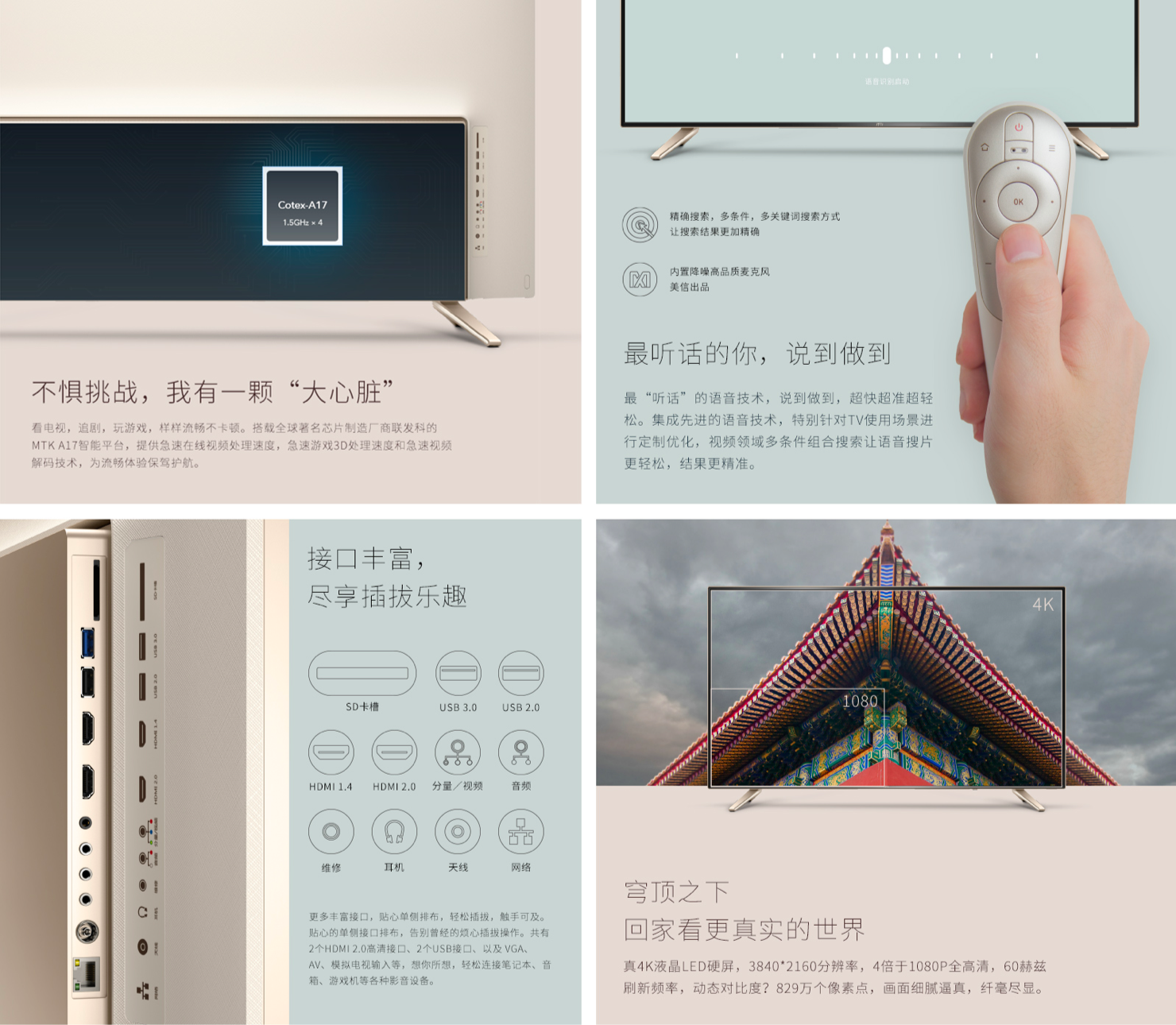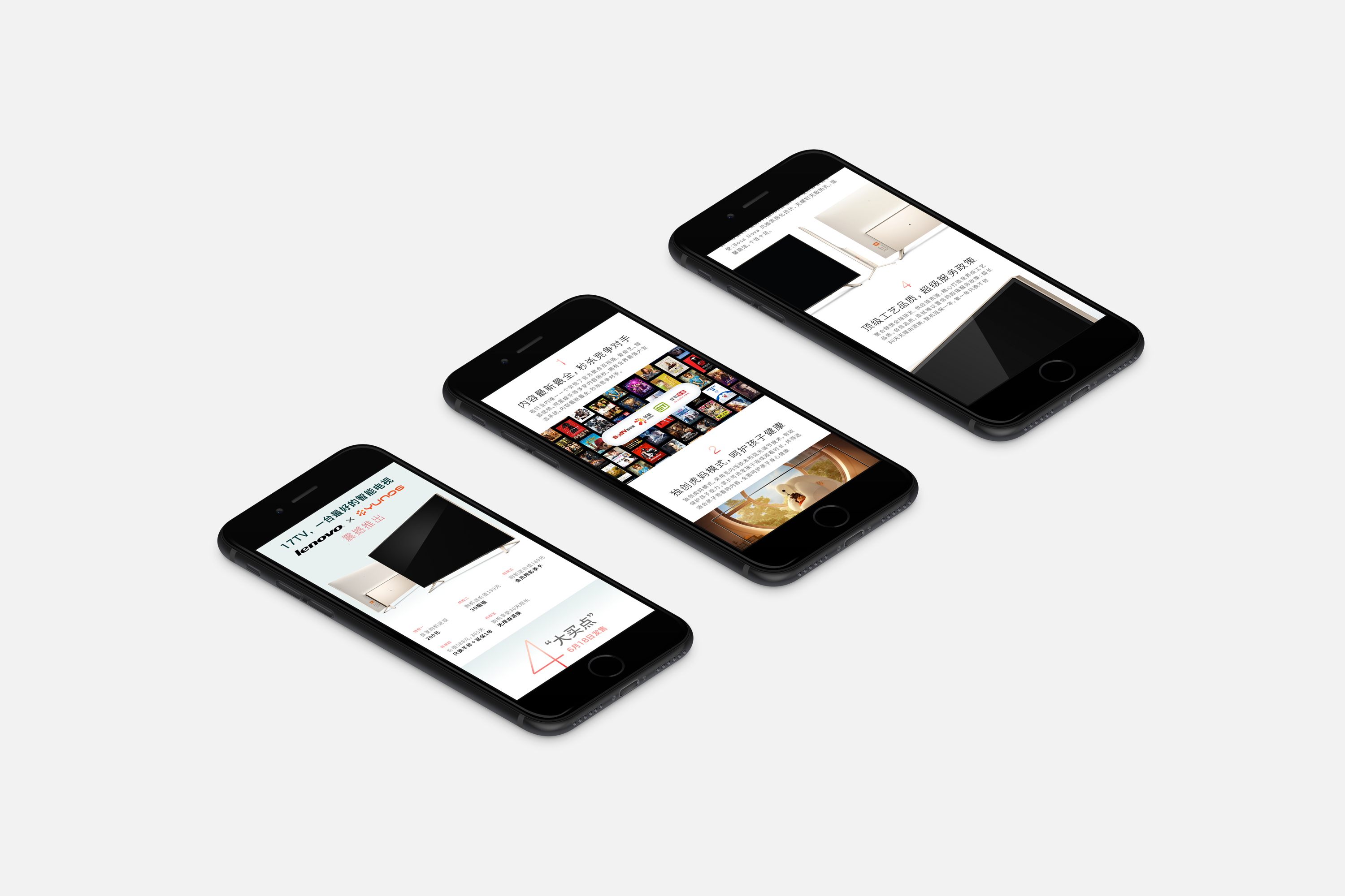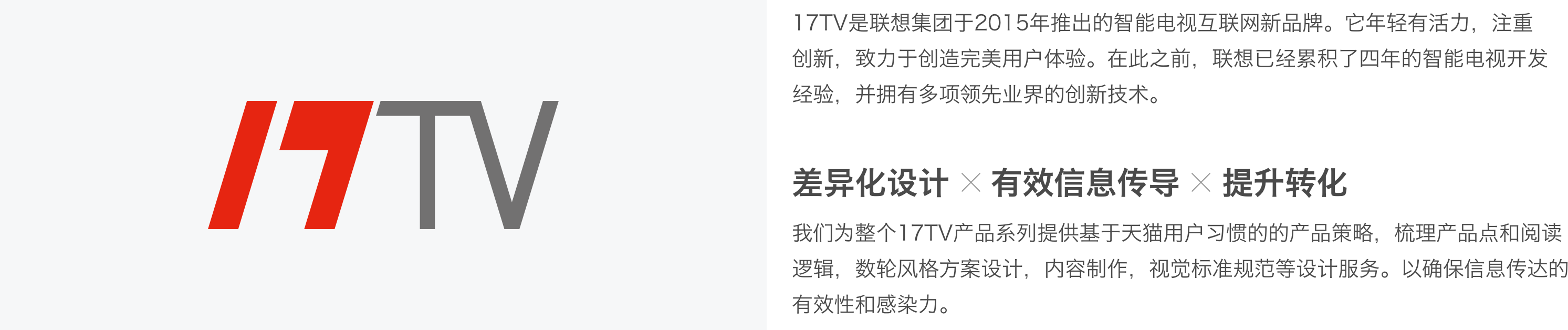 我们帮助联想设计了17TV第一阶段的天猫官网电脑端和手机端的页面,并配合电子商务营销输出产品内容,详情页面说明,产品图片拍摄等综合广告服务。我们协同工作,希望可以打造一个年轻化,有温度的差异化智能电视产品,并希望在市场中得到更多女性消费者的青睐。我们也大胆使用了轻快的色彩和简约的设计,帮助客户树立一个在互联网中使用,性格鲜明,易于快速识别的形象。