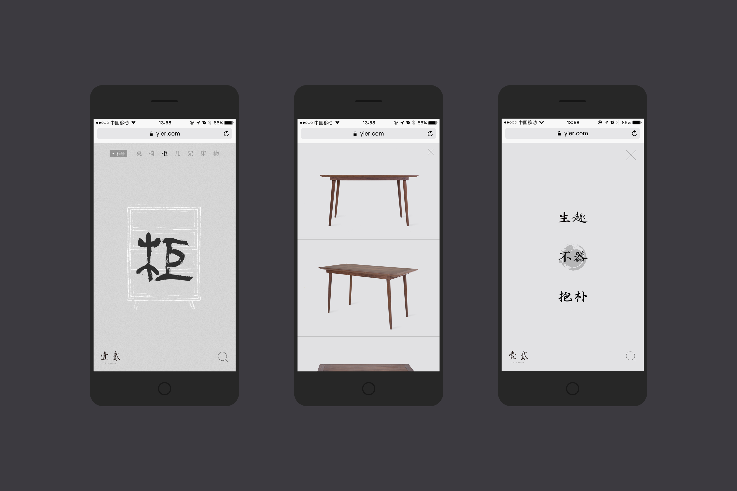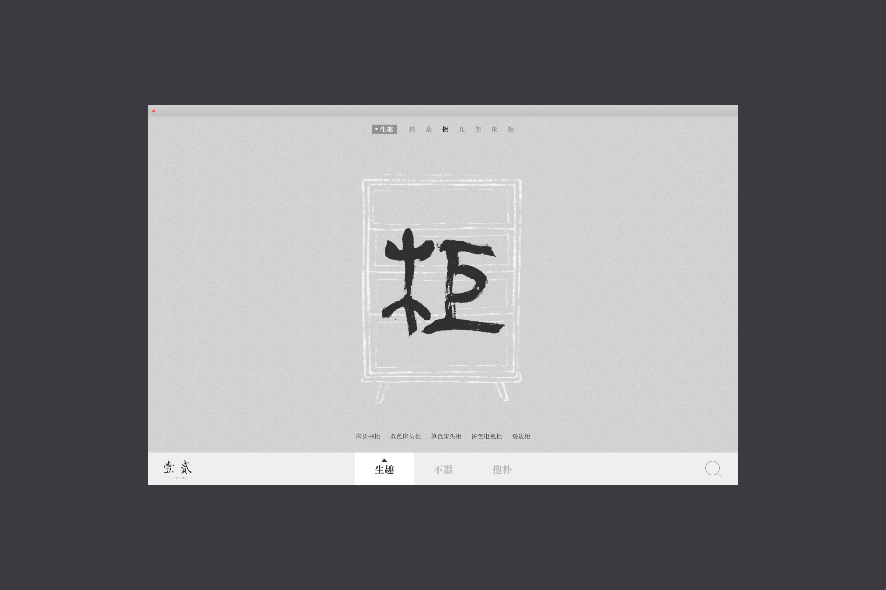 壹贰的所有产品分为三个大类:生趣、抱朴和不器,分别对应青年、中年、老年三个客群。每个大类中又分7个小类:桌、椅、柜、几、架、床、物。每个小类中又有若干物品不等。我们对这85个产品的显示方式进行了仔细考量,最终采用了目前的方式。进入网站后,要先选大类,进入首页后可以首页底部栏重新选择大类,小类切换栏设置在页面顶部,同时左侧显示大类标签作为标识。用户在页面左右两侧点击也可以切换不同小类;该类目下的所有产品出现在底栏上方,随类目切换而变。